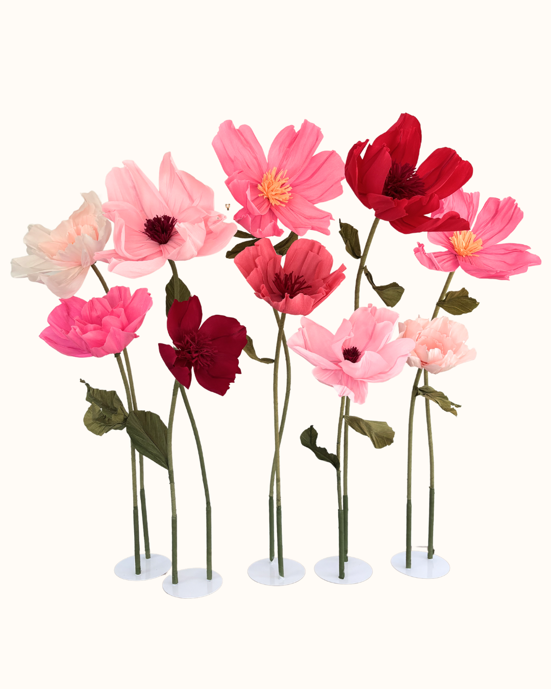 Giant handmade paper flowers available to hire across Auckland. Delivered, installed, and collected by us.